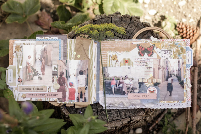 Первый разворот про историю города с фотографиями видов, фактурных стен. Для этого разворота я выбрала листы "Нарциссы" и "Энциклопедия". Заголовки во всех разоротах - это корешки от листов из набора 30х30 и высечки.